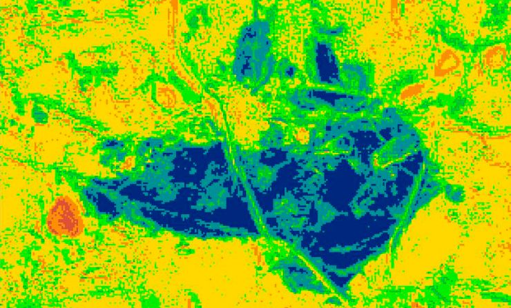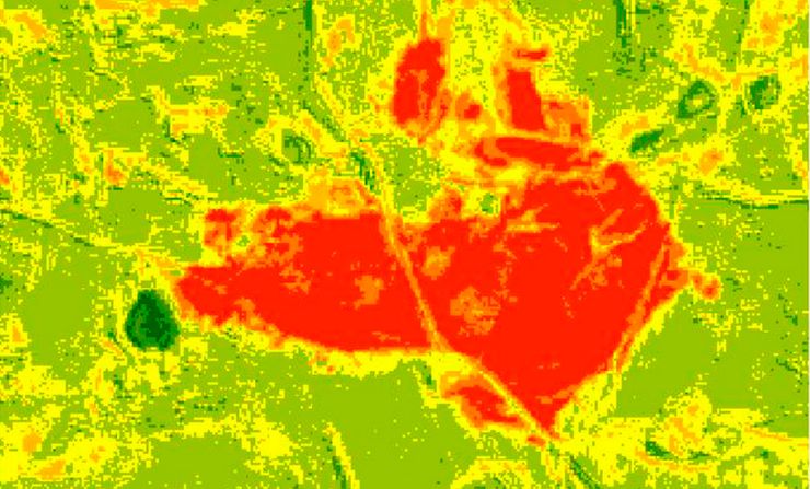 NDVI (Normalized Difference Vegetation Index) - нормализированный вегетационный стандартизированный индекс, показывающий наличие и состояние растительности. Этот индекс использует контраст характеристик двух каналов из набора мультиспектральных растровых данных— поглощения пигментом хлорофилла в красном канале (RED) и высокой отражательной способности растительного сырья в инфракрасном канале (NIR).